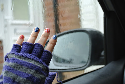 Oj, vad det har regnat idag. Jag vaknar tidigt av jourtelefonen och när jag väl är uppe så är jag uppe och beslutar mej för att följa med maken in till stan när han ska åka till kyrkan. Det här är en talande bild för dagen, regn, jubileumsnaglar ala Union Jack och kallt nog för vantar.