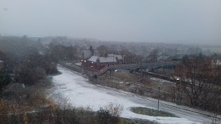 Fint att se lite snö:-), här blev det vitt idag och snötraktorn röjer och halt är det vid stationen för där har ingen hunnit med att sanda, en liten talgoxe satt på ryggstödet till en stol på balkongen och kikade in, så söt och den hittade en nöt:-)
